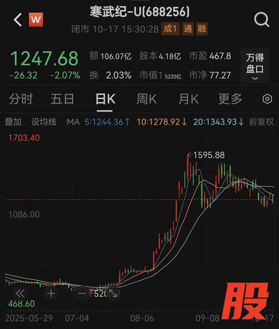 10月17日,寒武纪股价以1247.68元/股收盘,最新市值为5220亿元。