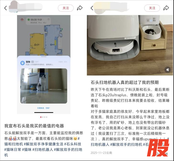 社交平台上,多猫家庭惊喜于石头扫地机让“地板没了猫砂和浮毛,干净到发亮”;靠石头解放双手、监控猫咪的铲屎官则高兴宣布“石头是我买的最值的电器”;还有人称,“家里3猫1狗,全靠石头续命。”