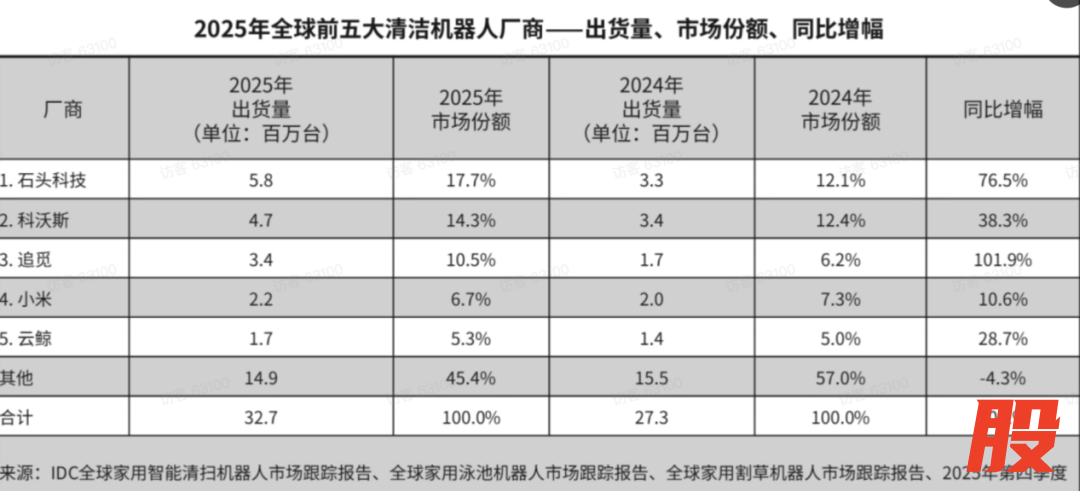IDC咨询报告显示,2025年,石头科技以17.7%的份额领跑全球清洁机器人市场,其智能扫地机器人2025下半年全球市场份额达到27.0%,连续两年获得扫地机器人全球销量与销额“双第一”。截至报告期末,公司产品已销往全球170多个国家和地区,智能机器人累计销量超过2500万。
