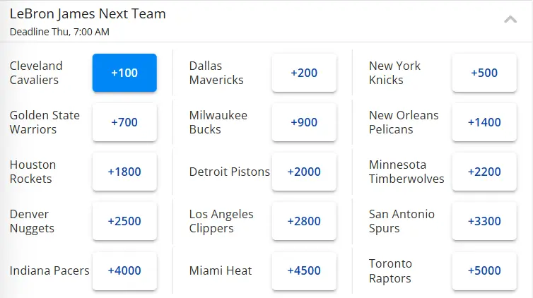 1.骑士(+100)、2.独行侠(+200)、3.尼克斯(+500)、4.勇士(+700)、5.雄鹿(+900)、6.鹈鹕(+1400)、7.火箭(+1800)、8.活塞(+2000)、9.森林狼(+2200)、10.掘金(+2500)、11.快船(+2800)、12、马刺(+3300)、13.步行者(+4000)、14.热火(+4500)、15.猛龙(+5000)。